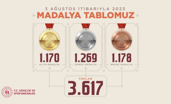 Gençlik ve Spor Bakanı Osman Aşkın Bak, sosyal medya hesabından, milli sporcuların 2023 yılında bin 170 altın, bin 269 gümüş, bin 178 bronz olmak üzere toplamda 3 bin 617 madalya kazandıklarını açıkladı.