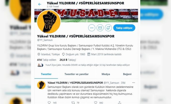 Kendisine ait sosyal medya hesabından açıklamalarda bulunan Yüksel Yıldırım, “Samsunspor Başkanı olarak son günlerde kulübün itibarının zedelenmesine izin vermem asla söz konusu olamaz! Samsunspor hakkında dışarıda dedikodu yapılmasını ve zor durumlara düşürülmesini hiç hoş bulmuyoruz. Kulübün itibarı bizim kırmızı çizgimiz ve namusumuzdur” diye konuştu.