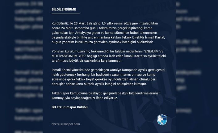 BB Erzurumspor 5 gün önce göreve getirilen Teknik Direktör İsmail Kartal’ın görevinden istifa etmesi üzerine açıklama yaptı. Kulüp resmi hesabından yapılan açıklamada, Kartal’ın ’Enerjim ve motivasyonum’ yok diyerek istifa ettiğini duyurdu.