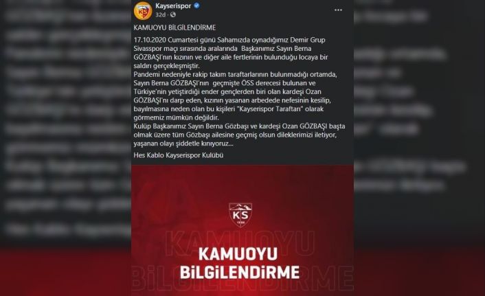Süper Lig’in 5. haftasında Kadir Has Stadı’nda oynanan Kayserispor - Sivasspor karşılaşması sırasında Kayserispor Başkanı Berna Gözbaşı’nın ailesinin bulunduğu locaya saldırı gerçekleşti. Kulüp tarafından yapılan yazılı açıklamada, "17.10.2020 Cumartesi günü sahamızda oynadığımız DG Sivasspor maçı sırasında aralarında Başkanımız Berna Gözbaşı’nın kızının ve diğer aile fertlerinin bulunduğu locaya bir saldırı gerçekleşmiştir. Pandemi nedeniyle rakip takım taraftarlarının bulunmadığı ortamda, Berna Gözbaşı’nın geçmişte ÖSS derecesi bulunan ve Türkiye’nin yetiştirdiği ender gençlerden biri olan kardeşi Ozan Gözbaşı’nı darp eden, kızının yaşanan arbedede nefesinin kesilip, bayılmasına neden olan bu kişileri ’Kayserispor Taraftarı’ olarak görmemiz mümkün değildir. Kulüp Başkanımız Berna Gözbaşı ve kardeşi Ozan Gözbaşı başta olmak üzere tüm Gözbaşı ailesine geçmiş olsun dileklerimizi iletiyor, yaşanan olayı şiddetle kınıyoruz" ifadelerine yer verildi.