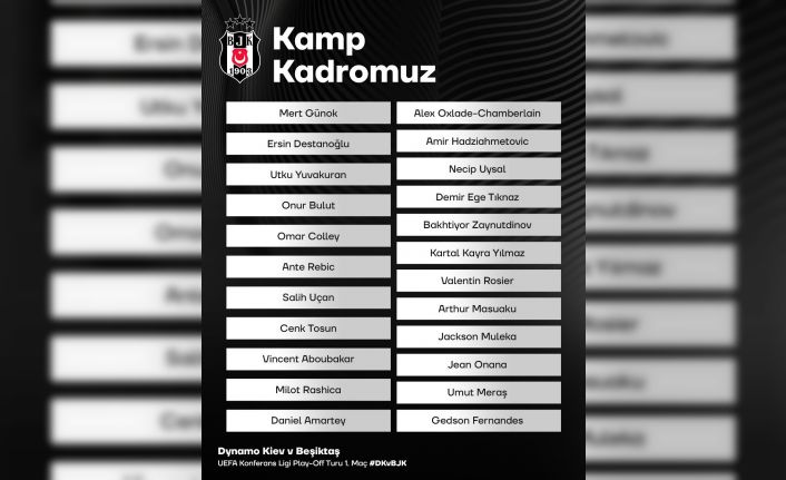 Beşiktaş, UEFA Avrupa Konferans Ligi Play-Off Turu ilk maçında yarın Ukrayna temsilcisi Dinamo Kiev ile Romanya’nın başkenti Bükreş’te karşı karşıya gelecek. Bu maç öncesi siyah-beyazlıların 23 kişilik kamp kadrosu belli oldu. İstanbul ekibinin UEFA’ya bildirdiği listede yeni transferler Alex-Oxlade Chamberlain, Milot Rashica ve Bakhtiyor Zaynutdinov da yer aldı.