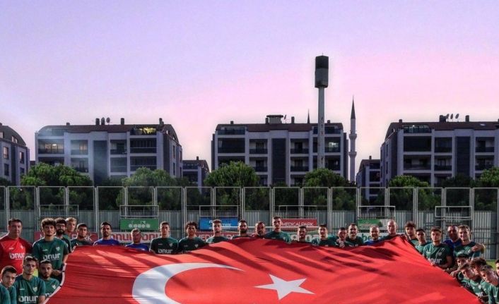 Bursaspor takım bu akşamki idman öncesi 30 Ağustos Zafer Bayramı’nı dev Türk bayrağı açarak kutladı.