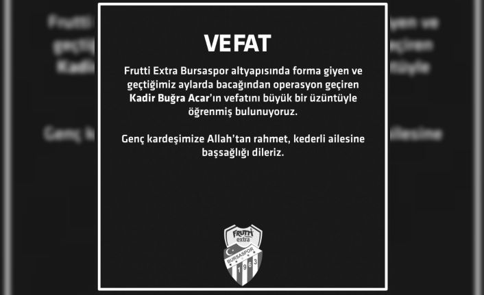 Frutti Extra Bursaspor altyapısında forma giyen Kadir Buğra Acar’ın vefat ettiği öğrenildi. Kulübün sosyal medya hesabından yapılan açıklamada, "Frutti Extra Bursaspor alt yapısında forma giyen ve geçtiğimiz aylarda bacağından operasyon geçiren Kadir Buğra Acar’ın vefatını büyük bir üzüntüyle öğrenmiş bulunuyoruz. Genç kardeşimize Allah’tan rahmet, kederli ailesine başsağlığı dileriz" ifadelerine yer verildi.