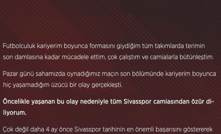 Osmanpaşa, camiadan özür dileyerek, “Futbolculuk kariyerim boyunca formasını giydiğim tüm takımlarda terimin son damlasına kadar mücadele ettim, çok çalıştım ve camialarla bütünleştim. Pazar günü sahamızda oynadığımız maçın son bölümünde kariyerim boyunca hiç yaşamadığım üzücü bir olay gerçekleşti. Öncelikle yaşanan bu olay nedeniyle tüm Sivasspor camiasından özür diliyorum. Çok değil daha 4 ay önce Sivasspor tarihinin en önemli başarısını göstererek Ziraat Türkiye Kupası’nı müzemize götürdük. Üst üste 3 sene Avrupa’ya giderek ülkemizi temsil ettik. Süper Lig’de başarılı sezonlar geçirdik. Tüm bu başarılarda tek tek hepimizin emeğinin olduğunu hatırlatmak isterim. Takım arkadaşlarım Erdoğan Yeşilyurt’a, Ali Şaşal Vural’a ve bana sezon başından beri devam eden tepkilerin bir sonucu olarak maçın son bölümünde böyle talihsiz bir olay yaşandı. Bizlerin de psikolojik olarak zorlandığını ve alınan başarısız sonuçlarda en az taraftarlar kadar üzüldüğümüzün unutulmamasını diliyorum. Sivasspor gibi değerli bir camiada bir daha bu tür olayın yaşanmamasını umuyor, stadyuma takımımızı desteklemek için gelen tüm taraftarların da bu konuda daha hassas olmalarını takımım adına diliyorum. Saygılarımla” ifadelerini kullandı.