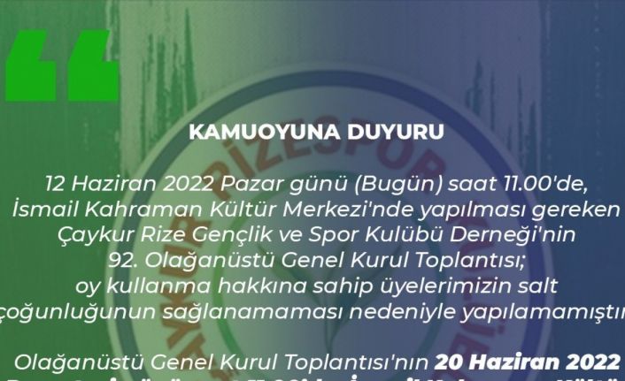 Ertelenen kongreyle ilgili olarak kulüpten yapılan açıklamada, "12 Haziran 2022 Pazar günü (Bugün) saat 11.00’de, İsmail Kahraman Kültür Merkezi’nde yapılması gereken Çaykur Rize Gençlik ve Spor Kulübü Derneği’nin 92. Olağanüstü Genel Kurul Toplantısı; oy kullanma hakkına sahip üyelerimizin salt çoğunluğunun sağlanamaması nedeniyle yapılamamıştır. Olağanüstü Genel Kurul Toplantısı’nın 20 Haziran 2022 Pazartesi günü saat 11.00’de, İsmail Kahraman Kültür Merkezi’nde, aynı gündemle, çoğunluğa bakılmaksızın yapılacaktır" ifadelerine yer verildi.