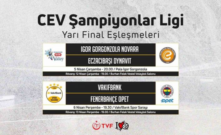 Yarı finalin diğer eşleşmesinde ise Eczacıbaşı Dynavit, milli voleybolcu Ebrar Karakurt’un formasını giydiği İtalya’nın Igor Gorgonzola Novara takımıyla karşılaşacak. Eczacıbaşı Dynavit - Igor Gorgonzola Novara eşleşmesindeki ilk maç 5 Nisan Çarşamba günü TSİ 20.00’de İtalya’da, ikinci mücadele de 12 Nisan Çarşamba günü saat 19.00’da TVF Burhan Felek Vestel Voleybol Salonu’nda oynanacak.