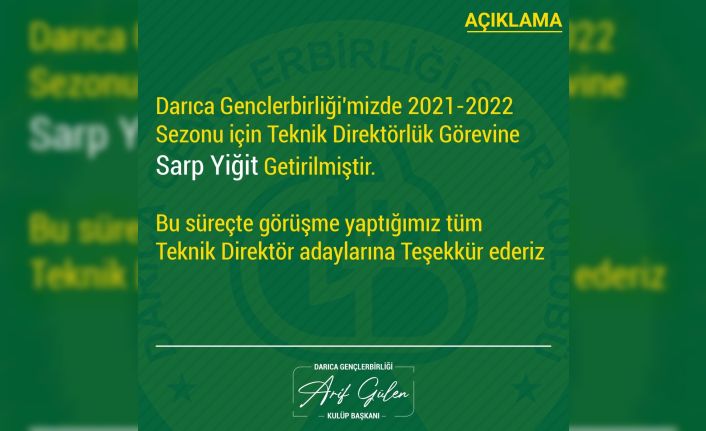 Kulüpten yapılan açıklamada, “Darıca Gençlerbirliğimizde 2021-2022 sezonu için teknik direktörlük görevine Sarp Yiğit getirilmiştir. Bu süreçte görüşme yaptığımız tüm teknik direktör adaylarına teşekkür ederiz” ifadelerine yer verildi.