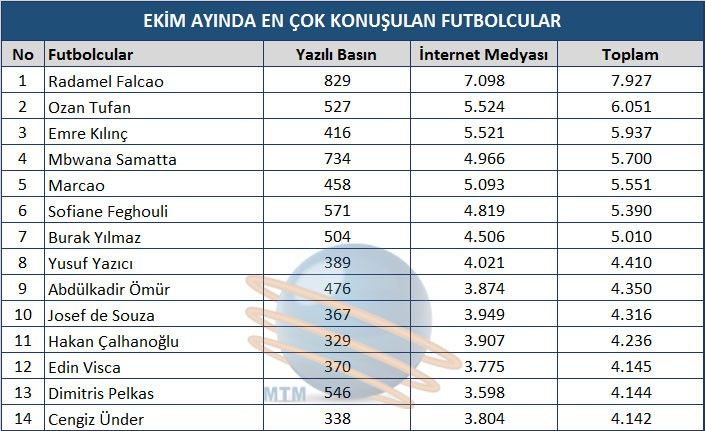 Ekim ayında medyanın en çok konuşulan takımları, futbolcuları, kulüp yöneticileri, teknik direktörleri ve hakemleri belli oldu. MTM, Türkiye Spor Yazarları Derneği için hazırladığı rapora göre, ay boyunca medyanın spor gündeminde en çok yer alan eden takım Fenerbahçe olurken, sezona hızlı bir başlangıç yaparak kritik gollere imza atan Radamel Falcao ise adını zirveye yazdırarak en popüler futbolcu olmayı başardı.