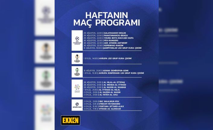 UEFA Şampiyonlar Ligi, UEFA Avrupa Ligi, UEFA Konferans Ligi, Suudi Arabistan Pro Lig ve Hollanda Eredivisie Ligi’nde birbirinden önemli maçlar EXXEN’den futbolseverlere aktarılacak. Öte yandan Şampiyonlar Ligi, Avrupa Ligi ve Konferans Ligi grup kura çekimleri de EXXEN’de olacak.