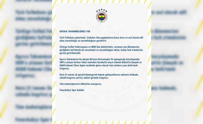 Fenerbahçe, Spor Toto Süper Lig’in 33. haftasında konuk olacağı Giresunspor karşılaşması öncesi Türkiye Futbol Federasyonu (TFF), MHK ve mücadelenin hakem kadrosuna ’Hataya tahammülümüz yok’ başlıklı adalet çağrısı yaptı.
