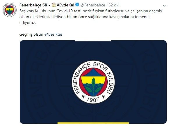 FENERBAHÇE KULÜBÜ, BİR FUTBOLCU VE BİR KULÜP ÇALIŞANINDA KORONA VİRÜS TESPİT EDİLEN BEŞİKTAŞ İÇİN GEÇMİŞ OLSUN MESAJI YAYIMLADI.