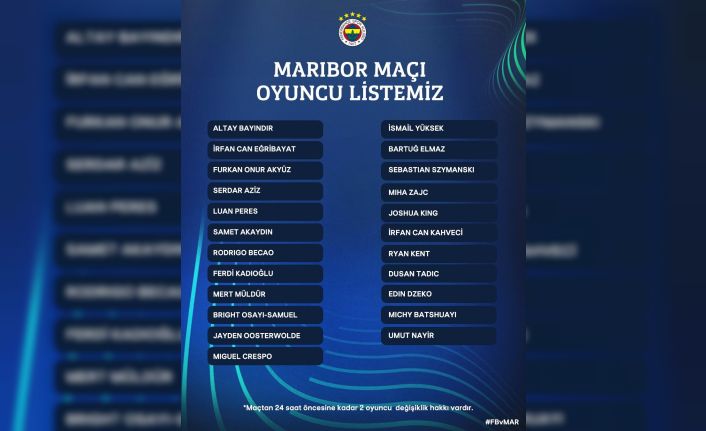 Fenerbahçe, 10 Ağustos Perşembe günü sahasında Slovenya ekibi Maribor ile oynayacağı UEFA Avrupa Konferans Ligi 3. ön eleme turu ilk maçı öncesinde kadrosunu UEFA’ya bildirdi. Sarı-lacivertlilerde yeni transferler Miha Zajc, Mert Müldür ve Bartuğ Elmaz’ın isimleri listede yer alırken, Mert Hakan Yandaş ve Alexander Djiku sakatlıkları nedeniyle kadroda bulunmuyor.