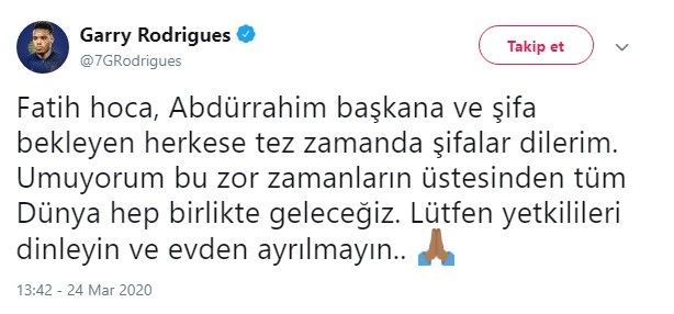 Sarı-lacivertli futbolcu, sosyal medya hesabından paylaştığı mesajında, "Fatih hoca, Abdürrahim başkana ve şifa bekleyen herkese tez zamanda şifalar dilerim. Umuyorum bu zor zamanların üstesinden tüm dünya hep birlikte geleceğiz. Lütfen yetkilileri dinleyin ve evden ayrılmayın" ifadelerini kullandı.