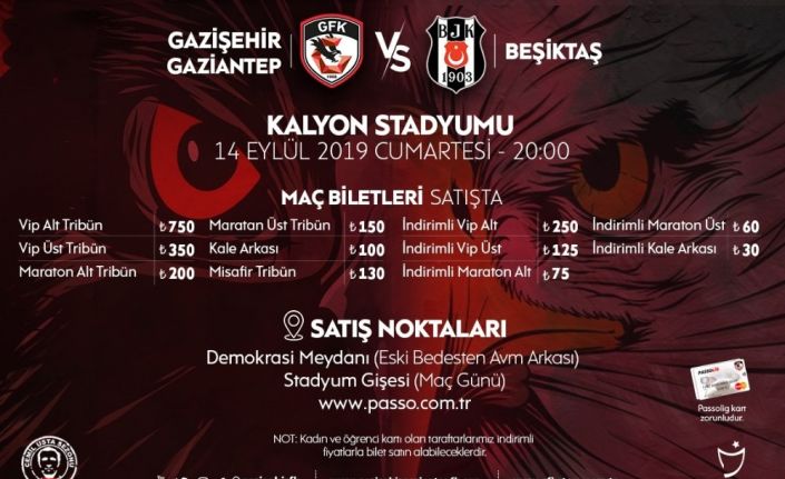 Gaziantep Kalyon Stadı’nda 14 Eylül Cumartesi günü saat 20.00’de oynanacak olan maçın biletleri www.passo.com.tr adresinden satışa sunuldu. Zorlu karşılaşmanın normal bilet fiyatları 100 lira ile 750 lira arasında satışa sunulurken kadın ve öğrenci taraftarlara yönelik bilet fiyatları ise 30 lira ile 250 lira arasında değişiyor. Kalyon Stadı’nda Beşiktaş taraftarına ayrılan misafir takım tribününün bilet fiyatı ise 130 lira olarak açıklandı.