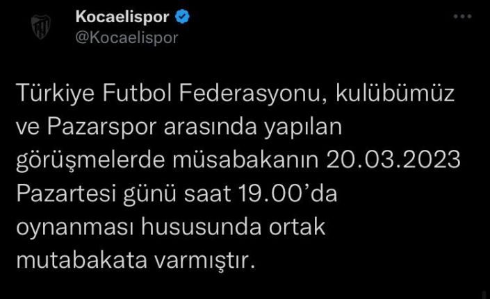 TFF 2. Lig Kırmızı Grup’ta bugün 14.00’da Kocaeli Stadyumu’nda oynanacak maç, Rize ekibi Pazarspor’un hava şartlarından dolayı gelememesi sebebiyle ertelendi. Müsabakanın Pazartesi akşamı 20.00’de oynanması konusunda kulüpler ve TFF arasında anlaşma sağlandı. Kocaelispor resmi sosyal medya hesabından yapılan açıklamada, “19.03.2023 Pazar günü saat 14.00’te Pazarspor ile oynayacağımız müsabaka öncesinde Pazarspor, elverişsiz hava şartlarından dolayı şehrimize gelememiştir. Türkiye Futbol Federasyonu, kulübümüz ve Pazarspor arasında yapılan görüşmelerde müsabakanın 20.03.2023 Pazartesi günü saat 19.00’da oynanması hususunda ortak mutabakata varmıştır” ifadelerine yer verildi.