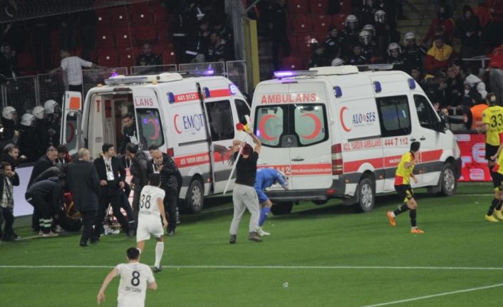 Bu sırada maçın durduğu dakikalarda tribünden sahaya atlayan bir Göztepeli taraftar, korner direğini yerinden sökerek ambulansın önündeki Altay kalecisi Ozan Evrim Özenç’e saldırdı. Yerde kalan Altay kalecisi Ozan Evrim Özenç, ambulansla hastaneye kaldırıldı. Maçın hakemi Emre Kargın’ın da isteğiyle iki takım futbolcuları soyunma odasına gitti. Yaklaşık yarım saat sonra müsabakanın tatil edildiği açıklandı.