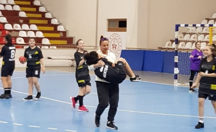 Amasya’da bir hentbol maçında kadın antrenör, sakatlanan sporcusunu kucağına alarak saha kenarına taşıdı.