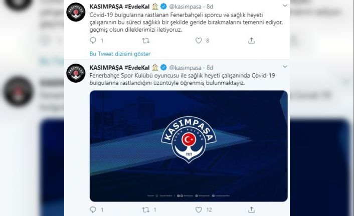 KASIMPAŞA, BİR FUTBOLCUSU VE BİR ÇALIŞANINDA KORONAVİRÜS TESPİT EDİLEN FENERBAHÇE İÇİN GEÇMİŞ OLSUN MESAJI YAYINLADI.