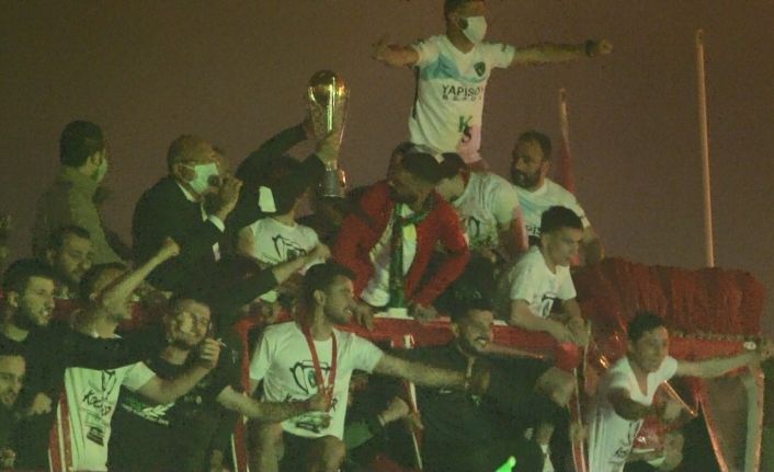 TFF 1. Lig’e yükselen Kocaelispor, 4-0’lık galibiyet sonrası şampiyonluk kupası ile kente döndü. Üstü açık otobüsle şehir turu atan futbolcular ve yönetim, üst lige çıkma coşkusunu taraftarıyla paylaştı. Şehir turu atan yeşil beyazlıların sevincine binlerce araçla eşlik eden taraftarla ise takımını Milli İrade Meydanı’nda coşku ile karşıladı. Üstü açık otobüsle meydan giren futbolcu, teknik heyet ve yöneticileri taşıyan otobüs, meşalelerle karşılandı.