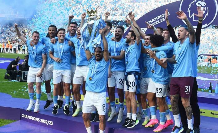 Premier Lig’in 37. haftasında Manchester City, Etihad Stadı’nda Chelsea’yi konuk etti. Ev sahibi ekip 12. dakikada Julian Alvarez’in golüyle rakibini 1-0 yendi. Arsenal’in dün yenilmesiyle şampiyonluğunu ilan eden Manchester City, bugünkü galibiyetin ardından şampiyonluk kupasını düzenlenen törenle aldı. Oyuncular törende büyük sevinç yaşadı.