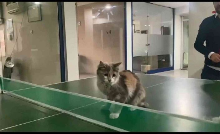 Bursa’da bir iş merkezinde masa tenisi oynayanların oyununa dahil olmak isteyen kedi, masaya atlayarak oyuna eşlik etti. Patilerini raket gibi kullanarak diğer oyunculara rakip olan kedinin eğlenceli anları kameralara yansıdı.
