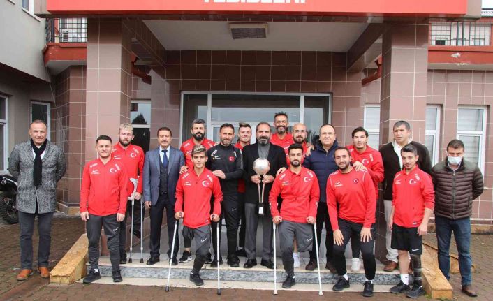 Avrupa Şampiyonası finalinde İspanya’yı 6-0 yenerek üst üste ikinci kez şampiyon olan Ampute Futbol Milli Takımı’nda Teknik Direktör Osman Çakmak ve futbolcular Sivasspor Kulübü’nü ziyaret etti.
