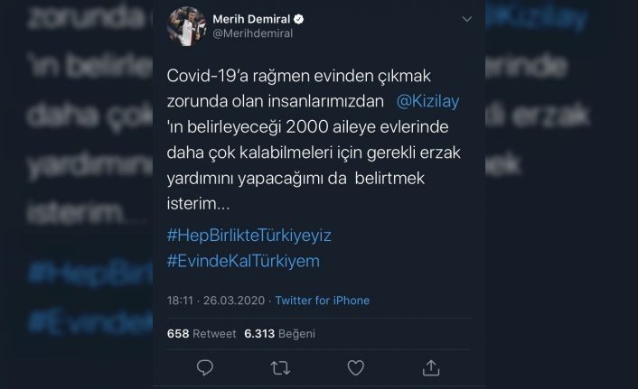 "Covid-19’a rağmen evinden çıkmak zorunda olan insanlarımızdan Kizilay’ın belirleyeceği 2000 aileye evlerinde daha çok kalabilmeleri için gerekli erzak yardımını yapacağımı da belirtmek isterim."