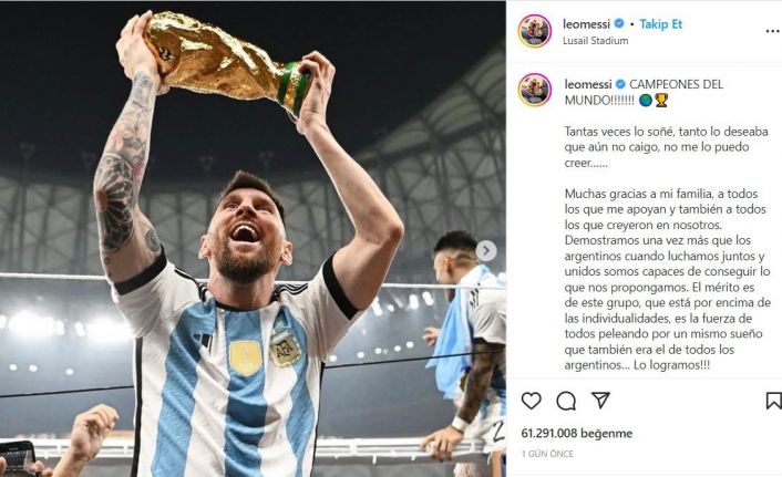Messi’nin Instagram hesabından kupayı kaldırdığı fotoğraf, 61,29 milyon kişi tarafından beğenilerek sosyal paylaşım sitesinde yeni rekorun sahibi oldu.