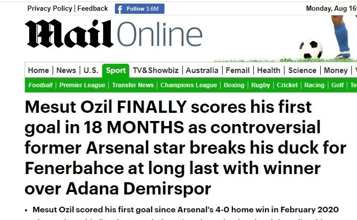 Süper Lig’in ilk haftasında Adana Demirspor karşısında attığı golle takımına galibiyeti getiren Fenerbahçe’nin yıldız futbolcusu Mesut Özil, sarı-lacivertli formayla ilk golünü kaydetti. Özil’in Fenerbahçe formasıyla attığı ilk gol İngiliz, İtalyan ve Alman basınında yer alırken, birçok medya kuruluşu ise Özil’in ilk gol sevincini manşetlere taşıdı. Dünya basınında Özil’in golü, ’Taraftarı olduğu kulüpte ilk golü’, ’Fenerbahçe ile 18 ay sonra golünü attı’, ’Özil, attığı golle Balotelli’li Adana Demirspor’u mağlup etti’ şeklinde yer aldı.Mesut Özil’in ilk golü dünya basınında
