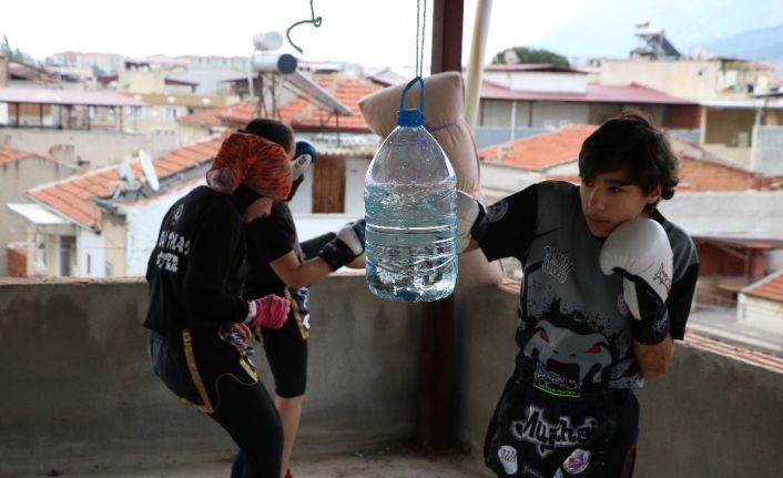 Korona virüs pandemisi süresince spor salonlarının kapalı olması nedeniyle Avrupa da derecesi bulunan Muay Thai sporcusu Ömer Faruk, Şerife Naz ve Muhammet Öksüz kardeşler evlerinin çatısında içi su dolu pet şişe ve yastıklarla antrenmanlarını sürdürüyorlar. Ev çatısında şampiyonluğa hazırlanan sporcular antrenmanlarını bir gün bile aksatmıyor.