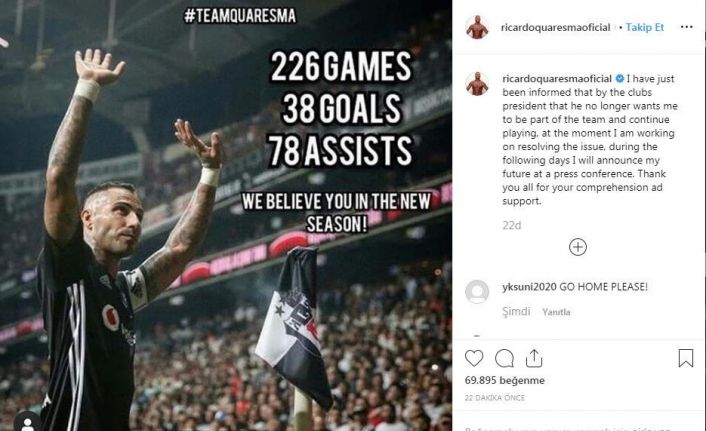 Beşiktaş’taki geleceği sık sık konuşulan Ricardo Quaresma’nın durumu belli oldu. Siyah-beyazlı futbolcu, sosyal medya hesabından yaptığı açıklama ile Başkan Fikret Orman ile bir görüşme yaptığını aktararak, Başkan Orman’ın kendisini takımda istemediğini ifade etti. 35 yaşındaki futbolcu, sosyal medya hesabından Beşiktaş kariyerinde oynadığı resmi maçlardaki performans istatistiklerinin yazılı olduğu bir fotoğrafını paylaşarak şu notu ekledi: