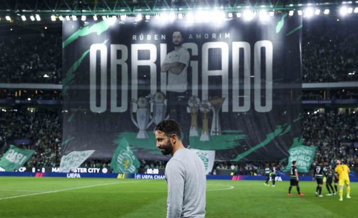 Portekiz’de Sporting ekibini çalıştıran ve geçtiğimiz günlerde Manchester United kulübü ile anlaşan Ruben Amorim, yeşil-beyazlı kulübe ve taraftarlara Şampiyonlar Ligi maçıyla veda etti. Jose Alvalade Stadyumu’nda Manchester City’yi konuk eden Sporting’de taraftarlar, karşılaşma öncesi Portekizli teknik adama sevgi gösterisinde bulundu. Mart 2020’den itibaren takımı çalıştıran Amorim için tribünlerde ’Obrigado (Teşekkürler)’ yazılı dev bir pankart açılırken, görselde genç çalıştırıcı ve kazandığı kupalar yer aldı.