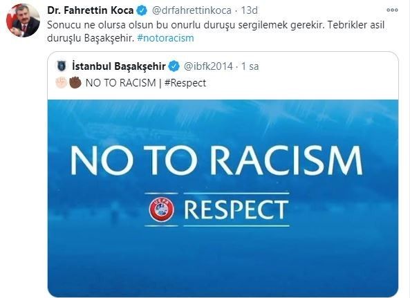 Başakşehir Yardımcı Antrenörü Webo’nun, Paris Saint-Germain maçının dördüncü hakemi Rumen Constantin Sebastian Coltescu tarafından ırkçılığa maruz kalması sonrasında Sağlık Bakanı Fahrettin Koca, yaptığı açıklamada, "Sonucu ne olursa olsun bu onurlu duruşu sergilemek gerekir. Tebrikler asil duruşlu Başakşehir" dedi.