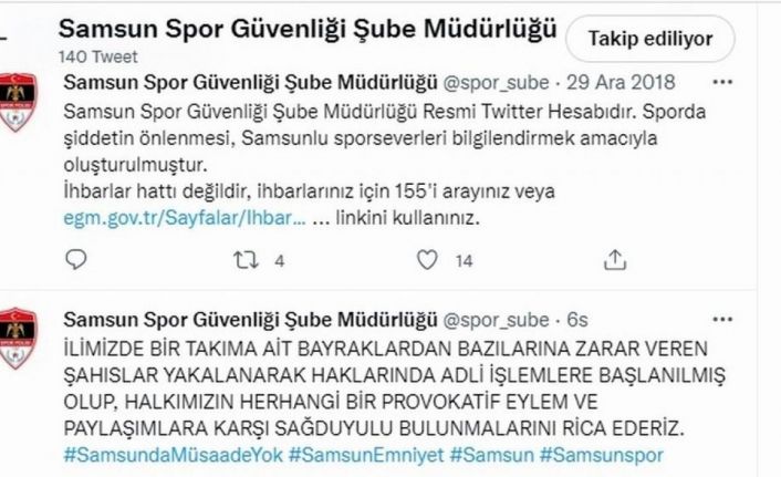 İl Emniyet Müdürlüğü Samsun Spor Güvenliği Şube Müdürlüğü, sosyal medya hesabından yaptığı açıklamada olay hakkında şu ifadelere yer verdi: