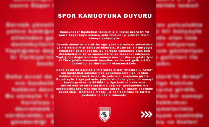 Samsunspor Kulübü (Derneği) Yönetim Kurulu tarafından yapılan açıklamada, “Samsunspor Basketbol takımımız bilindiği üzere 51 yıl sonra Süper Lig’e çıkmış, şehrimizi en iyi şekilde temsil etmeye çalışmıştır. Dernek yönetimi olarak bu ağır yükü barındıran yolculukta yalnız kaldığımızı defaatle bildirdik. Mütevazi bir bütçeyle elimizden geleni yaptık. Bu süreçte yanımızda olan tüm destekçilerimize ve sponsorlarımıza teşekkür ediyoruz. Yaptığımız değerlendirme sonucu mevcut durum gösteriyor ki Türkiye’nin ekonomik koşulları ve dernek gelirleri ile basketbol sürdürülebilir olamamaktadır. Daha evvel de açıkladığımız üzere bizler ‘Atatürk’lü arma’nın basketbol salonlarında yaşaması için lige katılım hakkını devretmek amacı ile yatırımcı arayışına girdik. Bu süreçte 1 aya yakındır şehrimizin önde gelen bir sanayi kuruluşu olan (!) SAMPA ile lige katılım hakkımızı devretmek ve şirketleştirme üzerine görüşmelerimiz sürdürüldü; sözümüz ona SAMPA süreci bir akşam saatinde gönderdiği Whatsapp mesajı ile sonlandırmış ve bizleri şaşkınlık içinde bırakmıştır. Bu süreçte yeni destekçiler ve yatırımcılarla görüşme konusunda zaman kaybetmiş bulunmaktayız. Konumuz ciddidir. Bu hususu belirtmek elzemdir. Var olan son durumu da bu geniş açıklamamız ile kamuoyuyla paylaşıyoruz” denildi.