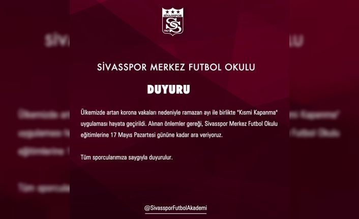 “Ülkemizde artan korona vakaları nedeniyle ramazan ayı ile birlikte “Kısmi Kapanma” uygulaması hayata geçirildi. Alınan önlemler gereği, Sivasspor Merkez Futbol Okulu eğitimlerine 17 Mayıs Pazartesi gününe kadar ara veriyoruz. Tüm sporcularımıza saygıyla duyurulur.”