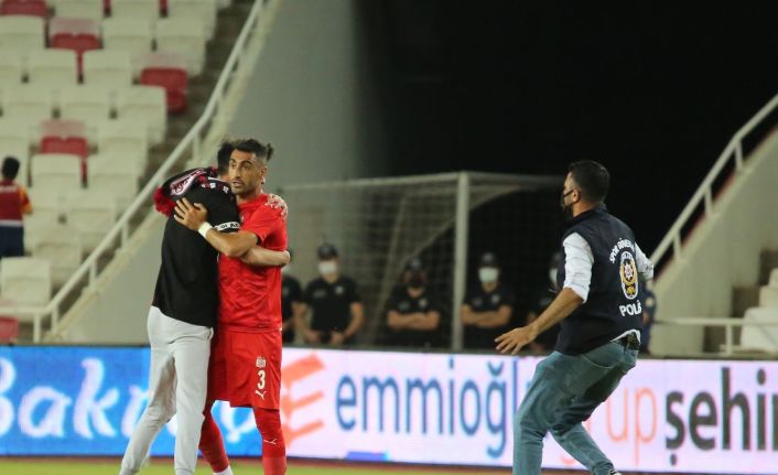 Sahaya giren taraftarı yakalamak isteyen güvenlik görevlileri, bir süre taraftarın arkasında koştu. Sivassporlu futbolcuya sarılan taraftar, güvenlik güçleri taraftarı yakaladı.