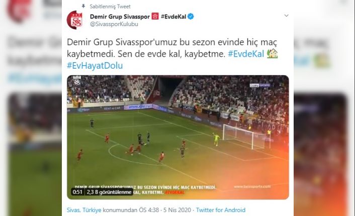 “Sivasspor’umuz bu sezon evinde hiç maç kaybetmedi. Sen de evde kal, kaybetme. Evde kal, ev hayat dolu.”