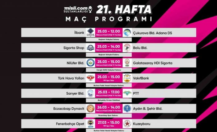 Misli.com Sultan Ligi’nde 21. hafta heyecanı yarın, 26 Mart Pazar ve 27 Mart Pazartesi günü oynanacak müsabakalarla yaşanacak. Haftanın açılış mücadelesinde İlbank ile Çukurova Belediyesi karşı karşıya gelecek. Fenerbahçe Opet ile Kuzeyboru arasında oynanacak karşılaşmayla hafta tamamlanacak.