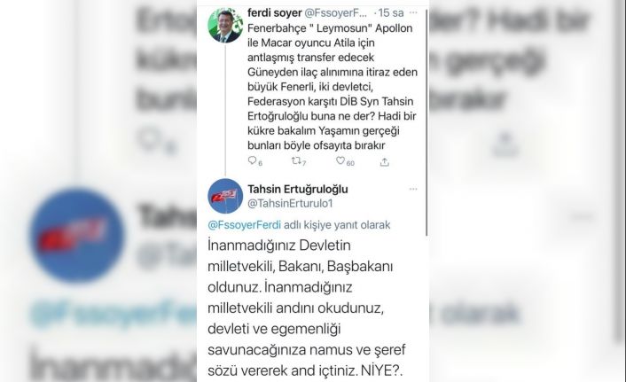 Ferdi Sabit Soyer, Fenerbahçe’nin transferi ile ilgili, "Fenerbahçe, Apollon’un Macar oyuncusu Attila için anlaşmış, transfer edecek. Güney’den ilaç alınımına itiraz eden büyük Fenerli, iki devletçi, federasyon karşıtı Dışişleri Bakanı Sayın Tahsin Ertuğruloğlu buna ne der. Hadi bir kükre bakalım. Yaşamın gerçeği bunları böyle ofsaytta bırakır" paylaşım yaptı.