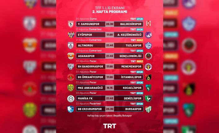 TRT Avaz’da canlı yayımlanacak TFF 1. Lig ikinci hafta karşılaşmaları şu şekilde;