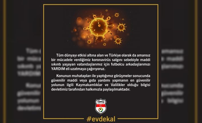 Türkiye Profesyonel Futbolcular Derneği, koronavirüs tedbirleri kapsamında evlerinden çıkamayan ve maddi zorluk içinde olan ailelere yardım edilmesi için futbol camiasına yardım çağrısında bulundu. TPFD’nin resmi internet sitesinden paylaşılan mesajda, "Tüm dünyayı etkisi altına alan ve Türkiye olarak da amansız bir mücadele verdiğimiz koronavirüs salgını sebebiyle maddi sıkıntı yaşayan vatandaşlarımız için futbolcu arkadaşlarımızı yardım eli uzatmaya çağırıyoruz. Konunun muhatapları ile yaptığımız görüşmeler sonucunda güvenilir maddi veya gıda yardımı yapmanın en güvenilir yolunun ilgili Kaymakamlıklar ve Valilikler olduğu bilgisi devletimiz tarafından halkımızla paylaşılmaktadır.