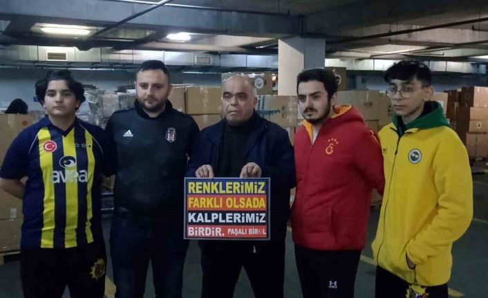 Galatasaray, Fenerbahçe ve Beşiktaş taraftarları, Ülker Stadyumu’ndaki yardım çalışmalarında ’renklerimiz farklı olsa da kalplerimiz bir’ pankartlarıyla birlik ve beraberlik mesajı vererek, yardım çalışmalarını yürüttüler.