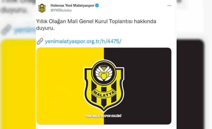 Yeni Malatyaspor’un söz konusu paylaşımında, “Yeni Malatyaspor Kulübü Derneğimizin, 31.05.2020 - 31.05.2021 tarihleri arasını kapsayan yıllık Olağan Mali Genel Kurul Toplantısı 5 Haziran Cumartesi günü saat 10.00’da Nurettin Soykan Tesisleri Altyapı Toplantı Salonunda yapılacaktır. Kongremiz yeterli çoğunluğun sağlanamaması halinde 12 Haziran Cumartesi günü saat 10.00‘da Battalgazi Belediyesi Konferans Salonunda yapılacaktır. Tüm üyelerimize önemle duyurulur” ifadelerine yer verildi.