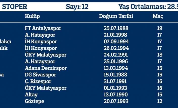 8+3 kuralının ardından yerli oyuncuların en fazla yoğunlaştığı mevki stoper oldu. Kulüpler mecbur oldukları yerli oyuncuları ağırlıklı olarak stoperde kullandı. Geçtiğimiz sezon ligimizde 1000 dakikayı geçen stoper sayısı sekizken bu sezon rakam yüzde 50’lik artışla 12’ye çıktı. İH Konyaspor’dan Abdülkerim Bardakcı, DG Sivasspor’dan Caner Osmanpaşa, Y. Malatyaspor’dan Semih Kaya, FT Antalyaspor’dan Veysel Sarı listedeki yerlerini korurken bu isimlere A. Hatayspor’dan Fatih Kurucuk ve Burak Öksüz, İH Konyaspor’dan Ahmet Yılmaz Çalık, Adana Demirspor’dan Samet Akaydın, Ç. Rizespor’dan Selim Ay, Yeni Malatyaspor’dan Sadık Çiftpınar, Altay’dan Murat Akça ve Göztepe’den Atınç Nukan da eklendi. A. Hatayspor, İH Konyaspor ve Y. Malatyaspor’da ikişer yerli stoper 1000 dakikanın üzerine çıkarken Altay’da da Murat Akça’nın yanında İbrahim Öztürk 955 dakika forma şansı yakaladı. Yaş ortalamasında ise 28.75’den 28.5’e küçük bir gerileme yaşandı.