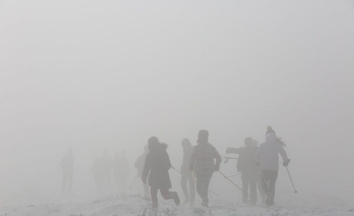 Hakkari’nin Yüksekova ilçesinde sis ve soğuk havaya rağmen kayakçılar antrenmanlarını aralıksız sürdürüyor.