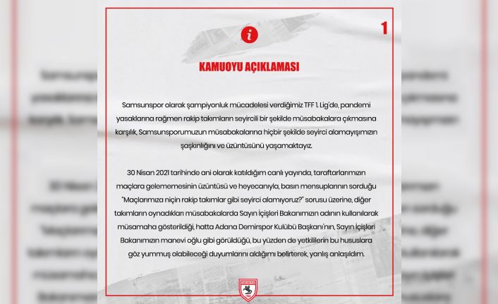 “Samsunspor olarak şampiyonluk mücadelesi verdiğimiz TFF 1. Lig’de pandemi yasaklarına rağmen rakip takımların seyircili bir şekilde müsabakalara çıkmasına karşılık, Samsunsporumuzun müsabakalarına hiçbir şekilde seyirci alamayışımızın şaşkınlığını ve üzüntüsünü yaşamaktayız. 30 Nisan 2021 tarihinde ani olarak katıldığım canlı yayında taraftarlarımızın maçlara gelememesinin üzüntüsü ve heyecanıyla basın mensuplarının sorduğu, ‘Maçlarımıza niçin rakip takımlar gibi seyirci alamıyoruz’ sorusu üzerine, diğer takımların oynadıkları müsabakalarda Sayın İçişleri Bakanımızın adının kullanılarak müsamaha gösterildiği hatta Adana Demirspor Kulübü Başkanının, Sayın İçişleri Bakanımızın manevi oğlu gibi görüldüğü, bu yüzden de yetkililerin bu hususlara göz yummuş olabileceği duyumlarını aldığımı belirterek, yanlış anlaşıldım. Pandemi yasakları sürecinde. Seyirci konusundaki olumsuzlukların önlenmesi amacıyla TFF’nin stadyumlara seyirci alınmaması konusunda yetkili mercilere yapmış olduğu yazılı tebligatlara rağmen bazı illerde gerekli önlemlerin alınmamış olması bizleri taraftarımız önünde zor duruma düşürmüştür. Benim amacım ve açıklamalarım Samsun ilimizde kurallara uyup da bazı illerde uyulmaması sonucu yaşadığımız mağduriyeti gündeme getirmek için yapılmıştır. Bütün ömrü terörle mücadele içinde geçen, ülkemizin birlik ve beraberliği adına gecesini gündüzüne katan Sayın İçişleri Bakanımızın ve emniyet teşkilatımızın yanlış anlaşılarak şahsım ve kulübüm üzerinden yıpratılmasına vesile olduğum için üzüntülerimi paylaşır, konuyu kamuoyunun takdirlerine sunarım.”