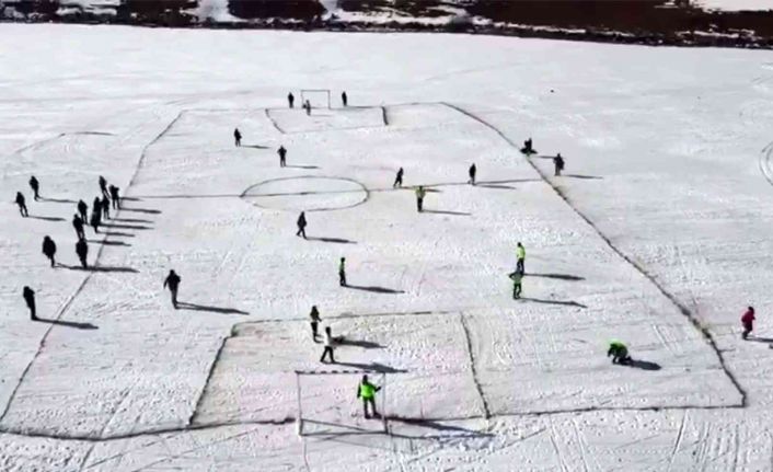 10 Ocak Çalışan Gazeteciler günü nedeniyle yüzeyi tamamen buzla kaplı Çıldır Gölü üzerinde futbol müsabakası yapıldı.