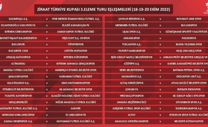 Ziraat Türkiye Kupası 3. Eleme Turu’nda 68 takım seri başı sistemine göre eşleşti. Müsabakalar 18, 19 ve 20 Ekim tarihlerinde tek maç eleme sistemine göre oynanacak.