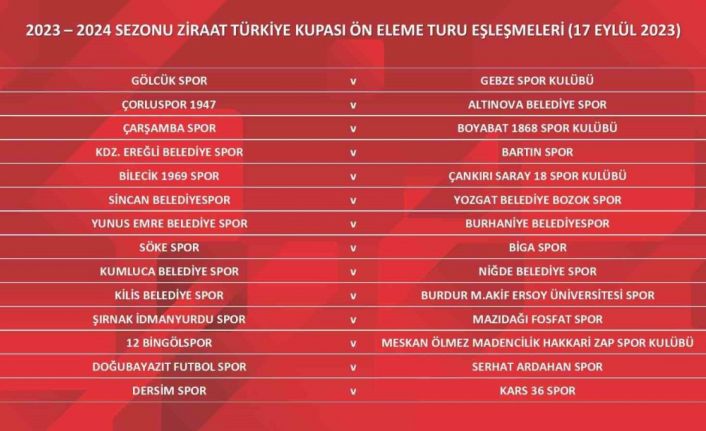 Ziraat Türkiye Kupası’nda Ön Eleme Turu karşılaşmaları 17 Eylül’de yapılacak. Tek maç eleme usülüne göre oynanacak müsabakalarda rakibini mağlup eden ekipler bir üst tura yükselecek.